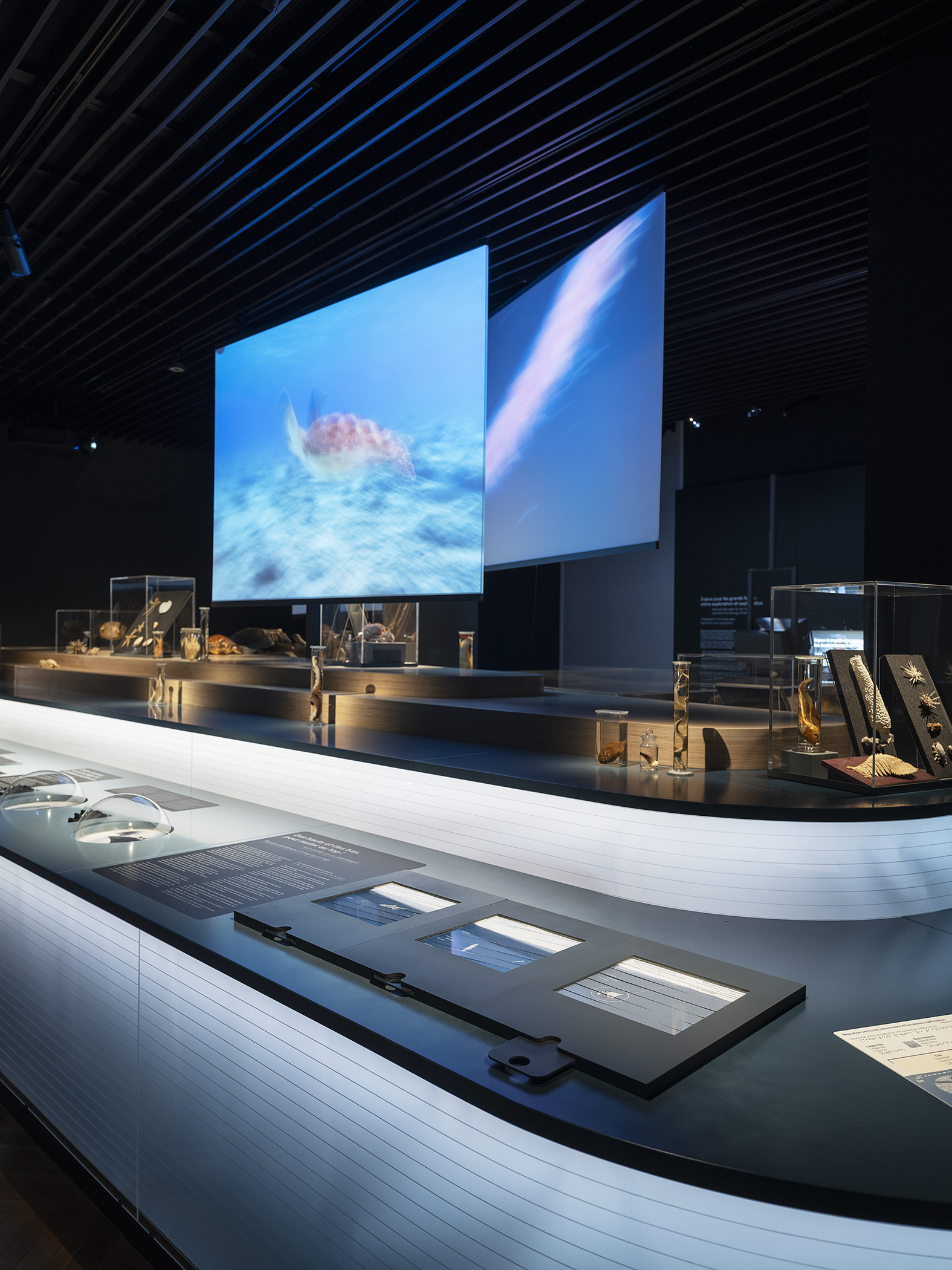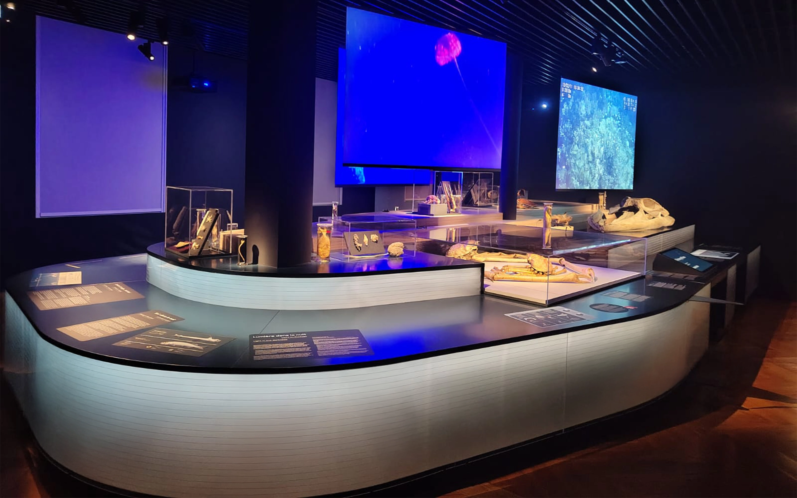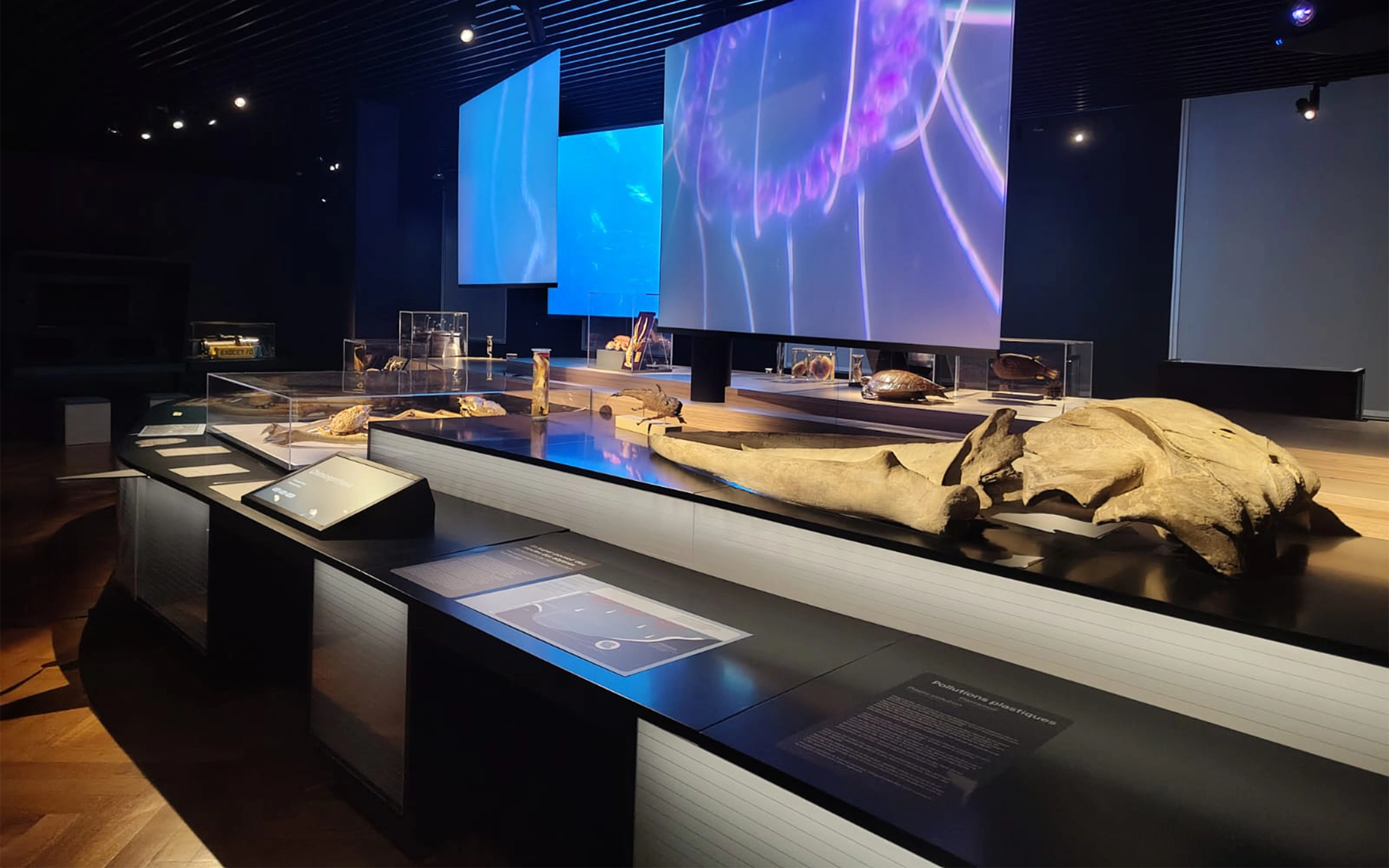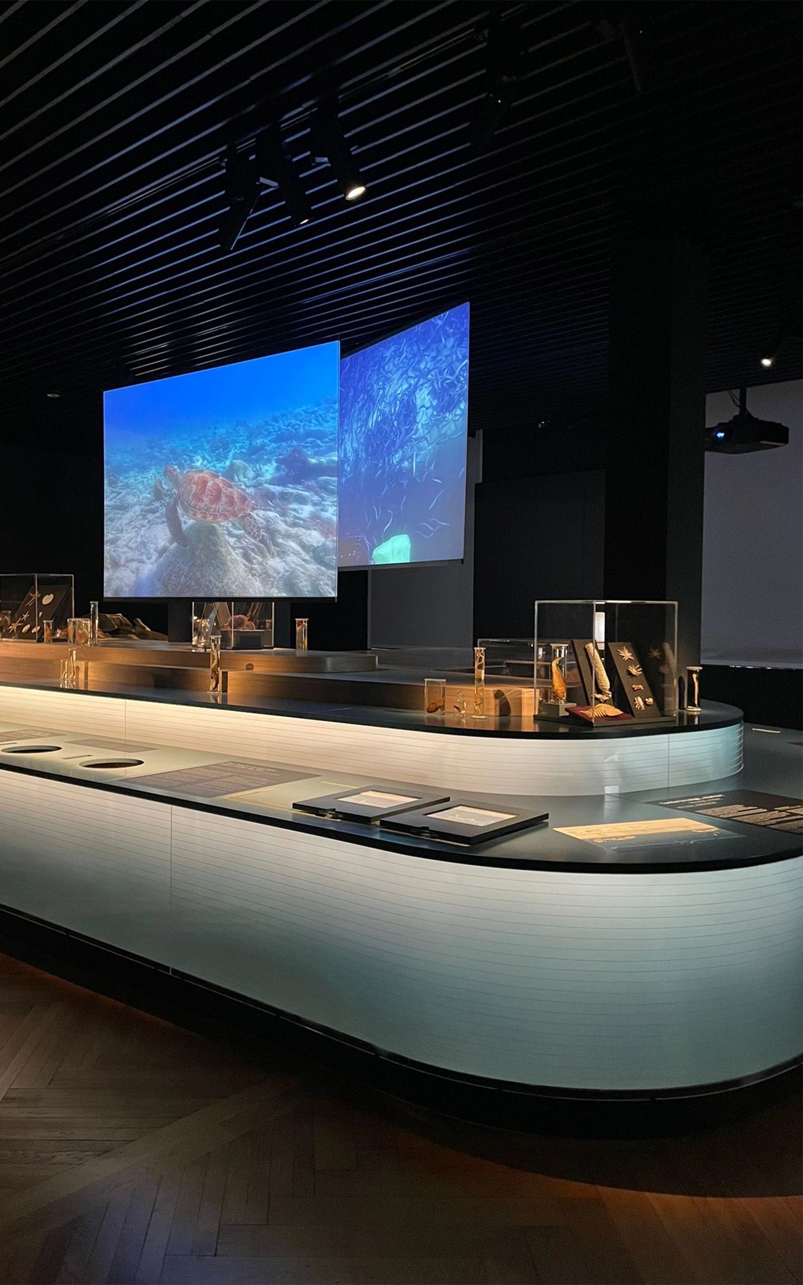 Composée de contreplaqué de bouleau et de panneaux de plexiglass. Un éclairage intégré sublime un dégradé de nuances bleues, rappelant les abysses. La structure, conçue pour accueillir un crâne de baleine ainsi que divers espaces d’exposition, répond à un défi technique d’envergure, alliant fonctionnalité et esthétique.