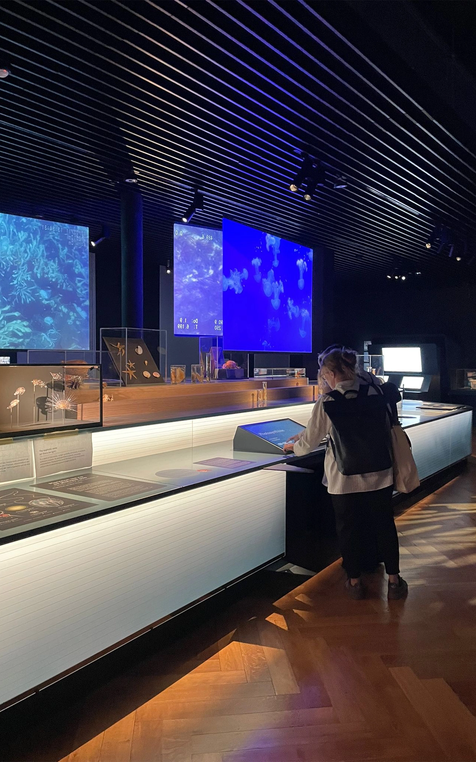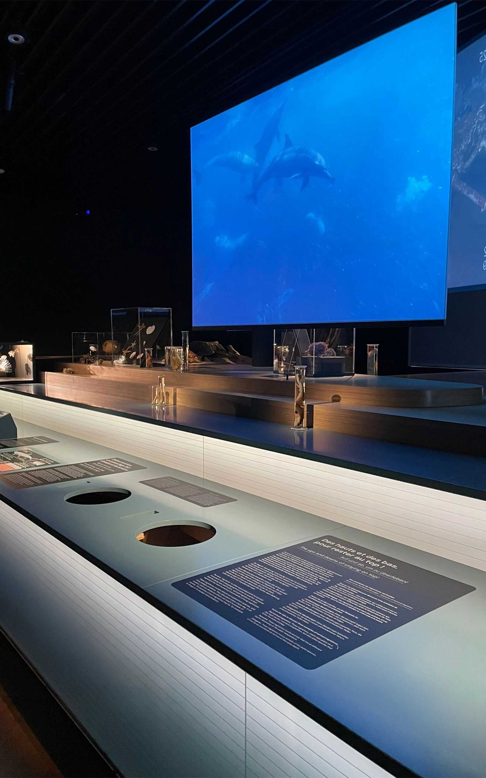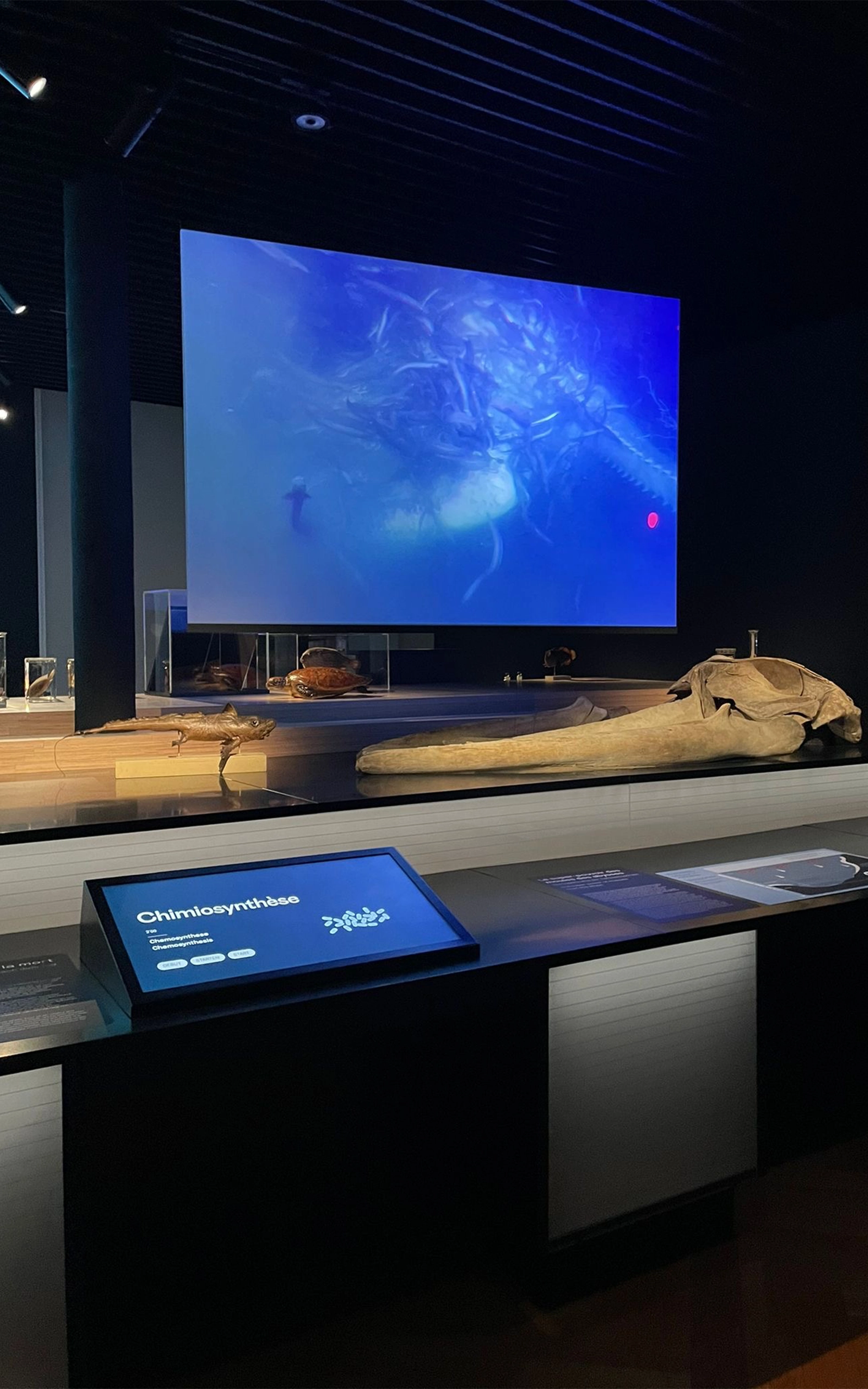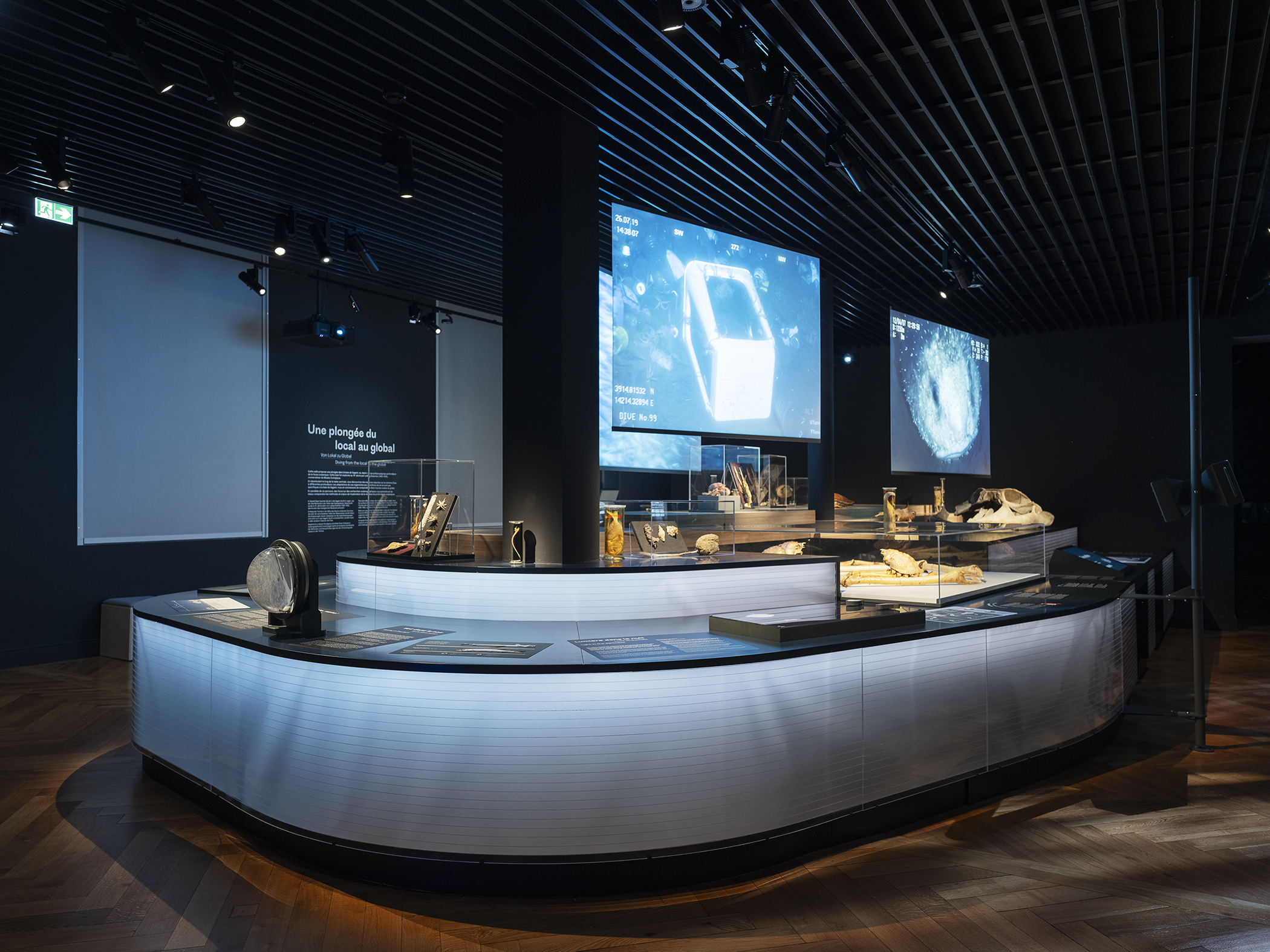 Composée de contreplaqué de bouleau et de panneaux de plexiglass. Un éclairage intégré sublime un dégradé de nuances bleues, rappelant les abysses. La structure, conçue pour accueillir un crâne de baleine ainsi que divers espaces d’exposition, répond à un défi technique d’envergure, alliant fonctionnalité et esthétique.