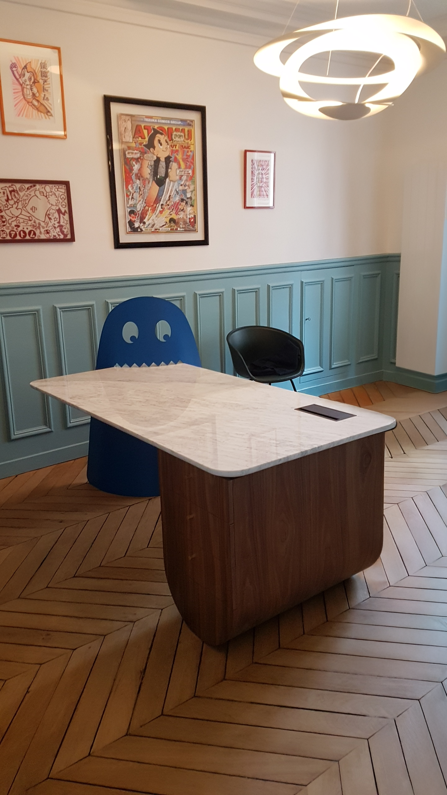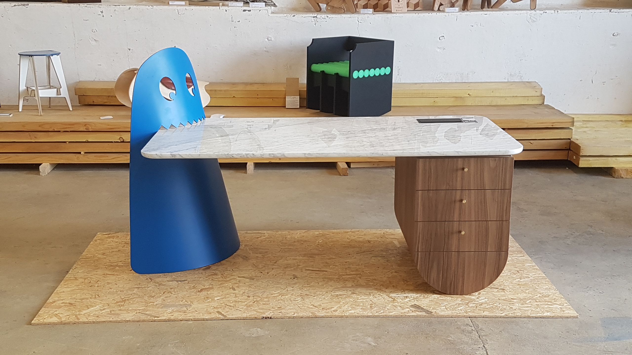 Le plateau, en marbre clair, repose sur une structure en noyer aux formes douces, contrastée par un élément fort et inattendu : un personnage inspiré de l’univers de Pac-Man, taillé dans une pièce massive d’aluminium laqué bleu. Ce personnage, véritable signature visuelle du projet, apporte un ton joyeux et singulier à l’ensemble.