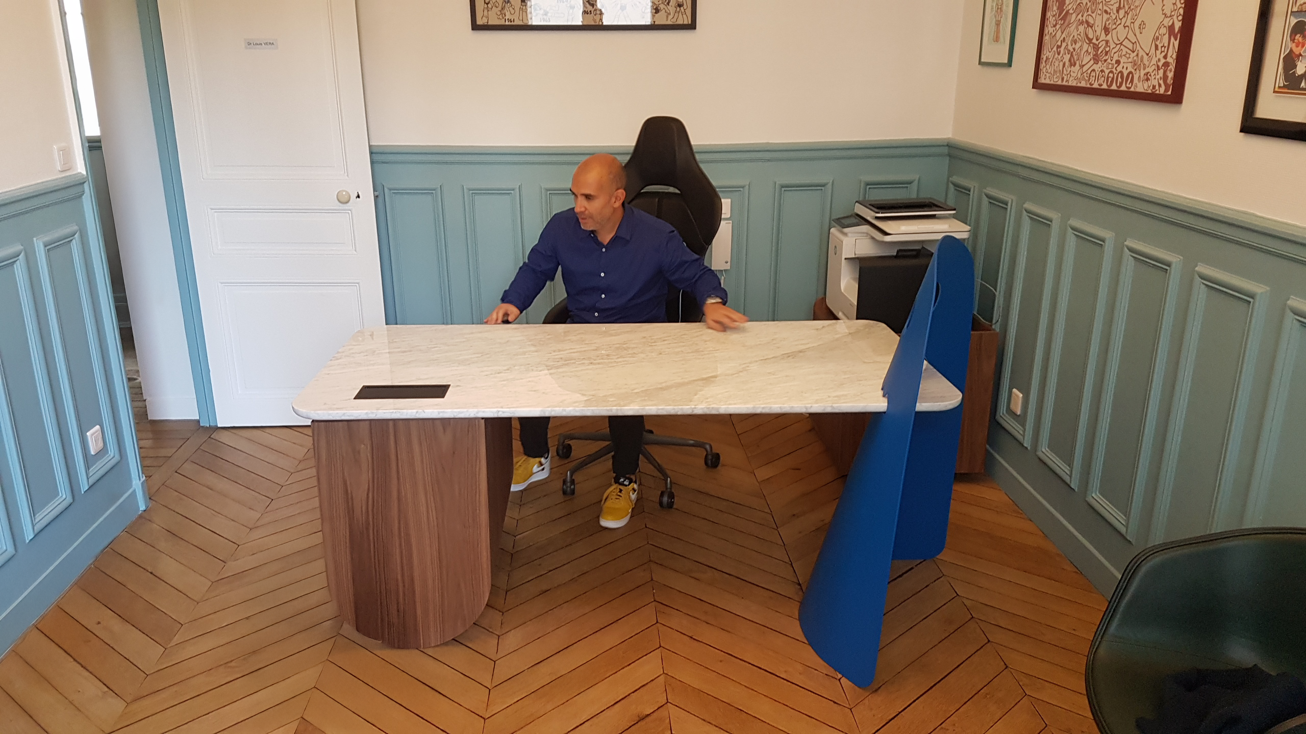 Nous avons été sollicités pour concevoir et fabriquer ce bureau sur-mesure, à la demande d’un client souhaitant un espace de travail qui sorte des sentiers battus. Une occasion pour nous d’allier notre savoir-faire à une touche ludique assumée, tout en conservant les codes d’un mobilier haut de gamme.