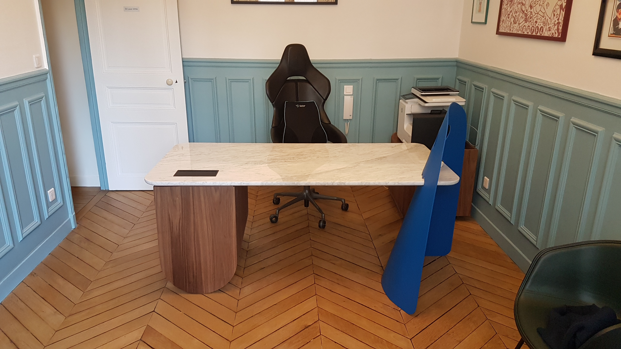 C’est dans un esprit à la fois décalé et raffiné que ce bureau a vu le jour. Pensé comme une pièce unique, ce projet mêle design contemporain, clin d’œil rétro et travail artisanal soigné.